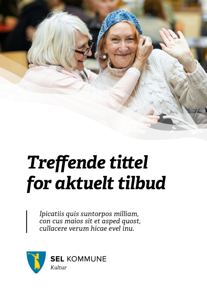 Forslag til hvordan profilen kan benyttes på foldere/flygeblad/invitasjoner. Anbefaler å bruke et bilde med et tydelig blikkfang, kort og god tekst, samt at avsender alltid skal være med. Bølgen skal også være en del av forsidene, og kan brukes i hvitt eller i de fire tilleggsfargene.