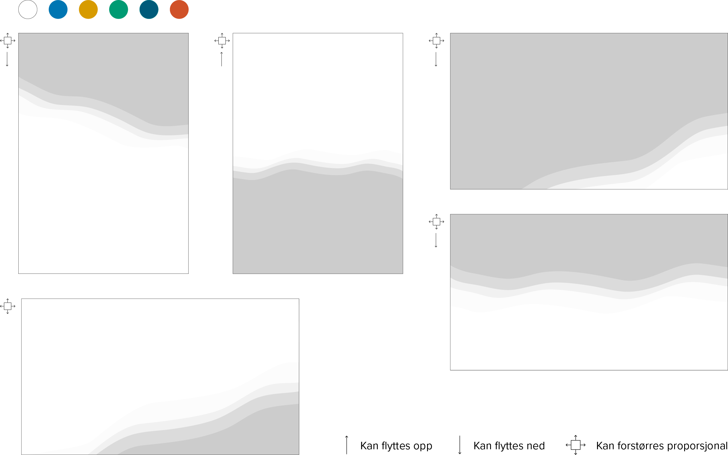 Elementet finnes i Sel-blå, hvit og i de fire tilleggsfargene. Sel-blå og hvit er hovedvarianter, men tilleggsfargene benyttes som supplement der det er behov for variasjon. Elementet kan benyttes sammen med bilder for å skape tydelig avsender og visuell sammenheng.